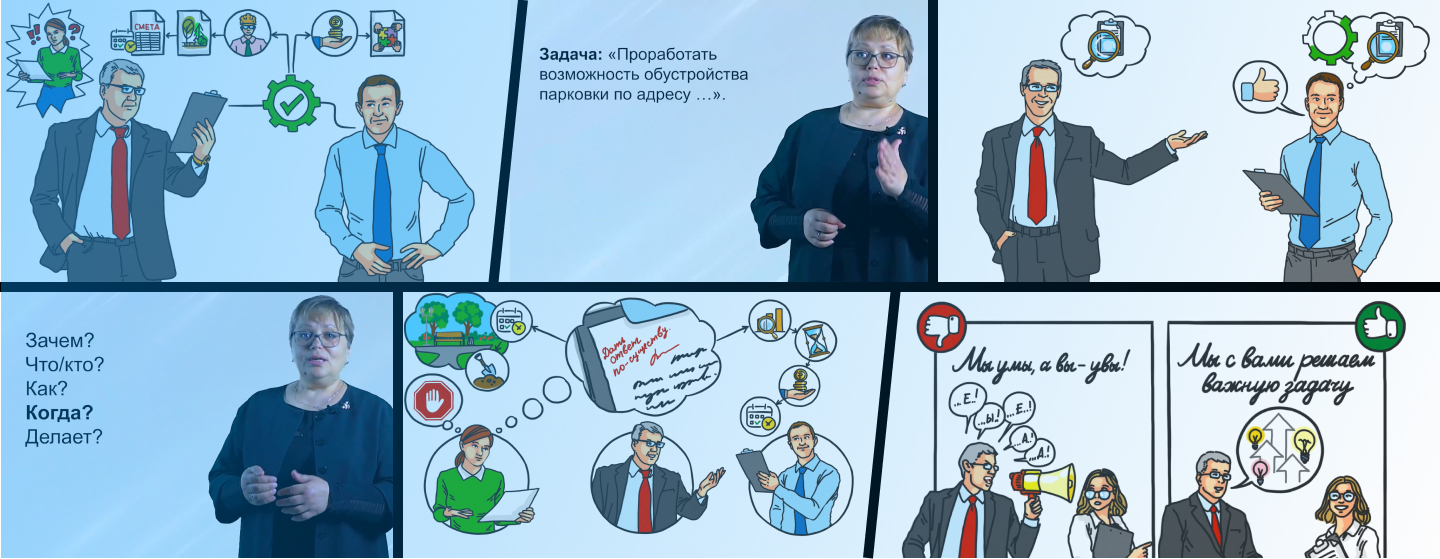 Весь курс умещается на одну листовку формата примерно A4. В сюжетном повествовании на листовке изложена типовая ситуация для целевой аудитории: житель района жалуется на благоустройство, жалоба попадает ответственному лицу и дальше понеслось…