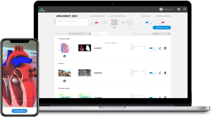 Дополните существующую реальность. Совмещайте изображения из физического мира и digital контент с помощью редактора ARGUMENT STUDIO. Редактируйте его в любой момент, назначайте роли, разделяйте контент на группы с системой авторизации по QR кодам, отслеживайте статистику.